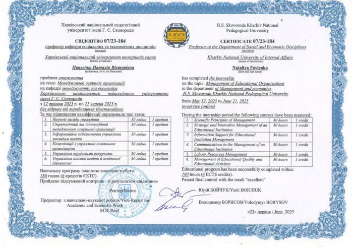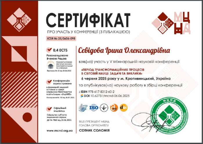 Таким чином, систематичне підвищення кваліфікації викладачів кафедри соціальних та економічних дисциплін, активна участь у наукових заходах сприяють розвитку науково-методичного потенціалу, підвищенню якості освітнього процесу та формуванню конкурентоспроможного фахівця в умовах сучасного освітнього середовища.