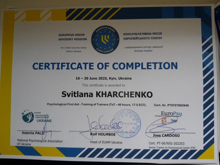 Професорка кафедри психології, соціології та педагогіки ННІ №3 Світлана ХАРЧЕНКО пройшла сертифікований тренінговий курс, який проводили тренери з португальської жандармерії – фахівці у сфері ментального здоров’я. Захід відбувся під патронатом Консультативної місії Європейського Союзу в межах реформування сектору цивільної безпеки України.