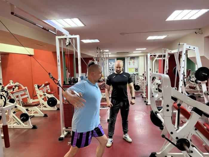 Чергове спеціалізоване тренування для учасника бойових дій, бійця 78-го окремого десантно-штурмового полку Сергія ОМАРОВА провів старший викладач кафедри спеціальної фізичної підготовки ННІ №2 Ігор ОСТРОВСЬКИЙ. Заняття проходило у тренажерному залі та було спрямоване на зміцнення м’язів грудей і рук, зокрема тріцепсів. Програма підібрана з урахуванням фізичних можливостей Сергія й адаптована для поступового відновлення функцій організму.