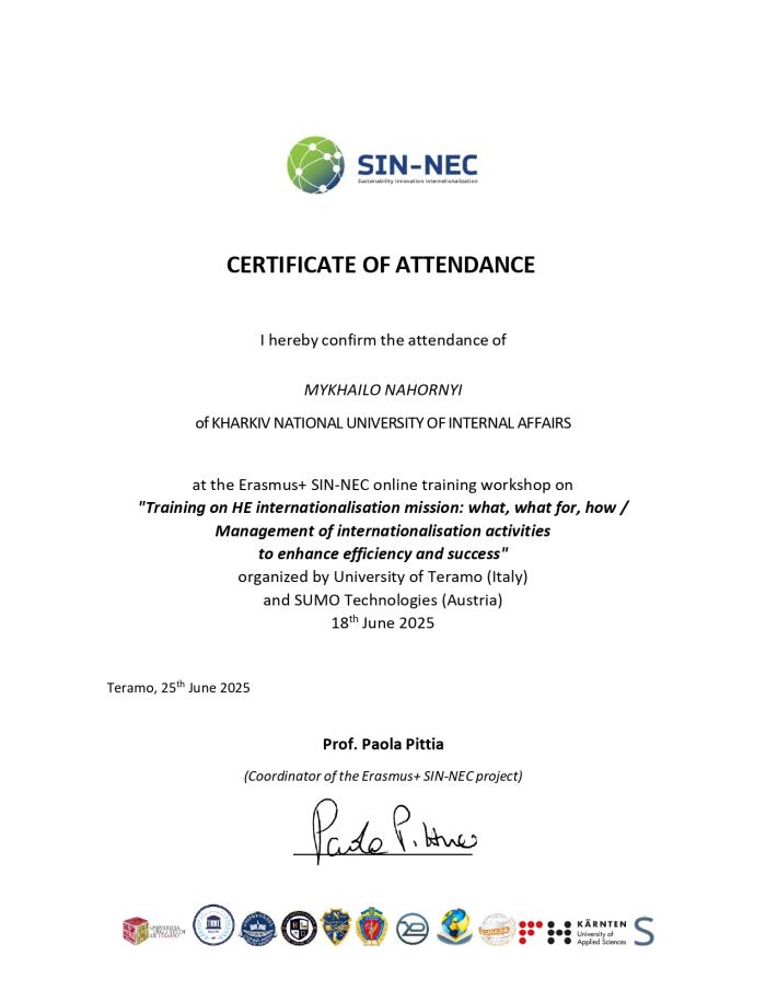 Тренінг проходив у межах проєкту Erasmus+ SIN-NEC «Сталість та спроможність інтернаціоналізації з метою модернізації вищої освіти для дебютантів із країн Східного партнерства» (SIN-NEC). Його організаторами виступили університет міста Терамо (Італія) спільно з компанією SUMO Technologies (Австрія). Учасники тренінгу обговорили ключові аспекти розроблення та управління міжнародними проєктами у сфері вищої освіти, зокрема: проєктування міжнародних ініціатив (Paola Pittia, UNITE); написання проєктів і ефективне управління ними (Rainer Svacinka, SUMO); роль студентів у процесах інтернаціоналізації ЗВО.