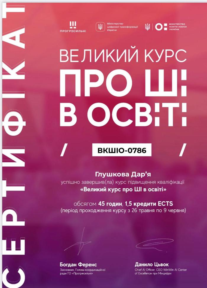 Доцентка кафедри правоохоронної діяльності ННІ №5 Дар’я ГЛУШКОВА успішно завершила навчальний курс, який відбувався за підтримки Міністерства цифрової трансформації України, Міністерства освіти і науки України та громадської організації «Прогресильні».