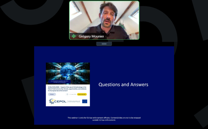 Представники науково-дослідної лабораторії з проблем правового забезпечення діяльності поліції та протидії злочинності – завідувач Костянтин БУГАЙЧУК і головна наукова співробітниця Олена ФЕДОСОВА – взяли участь у вебінарі «Вплив використання технологій штучного інтелекту в галузі внутрішньої безпеки: загрози, можливості та перспективи для європейських правоохоронних органів» (Impact of the use of AI technology in the field of internal security: threats, opportunities, and outlooks for European law enforcement), який проводився Європейським поліцейським коледжем (CEPOL).