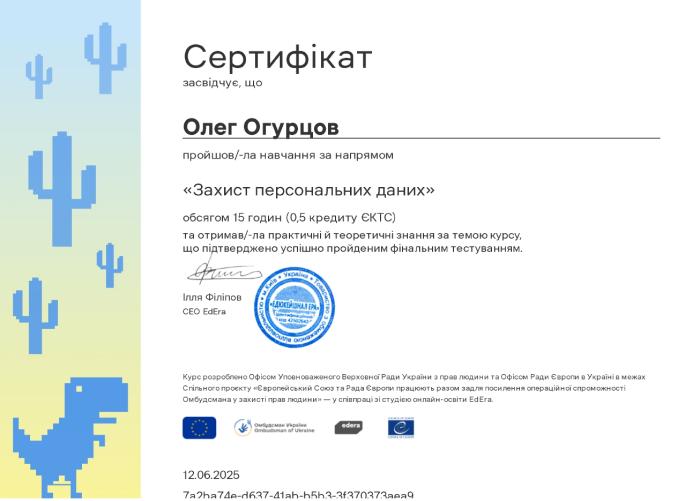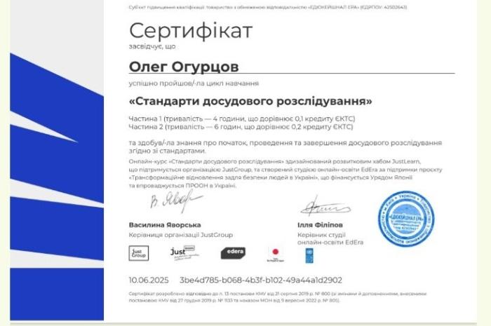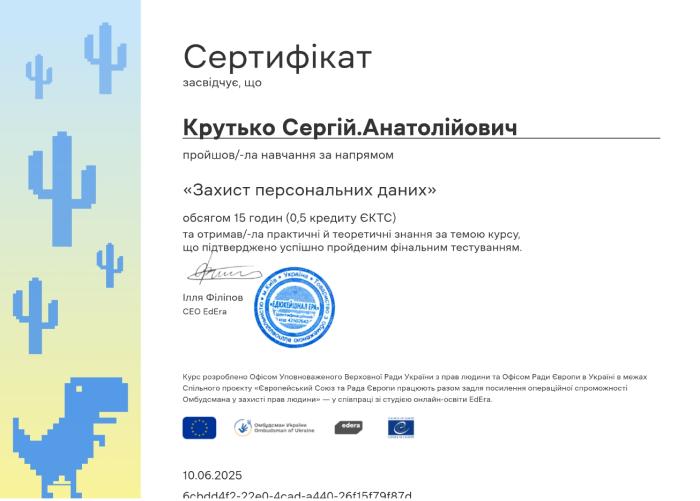 Сергій КРУТЬКО здобув нові знання за напрямами «Захист персональних даних», «Академічна доброчесність», «Зрозуміло про конфлікт інтересів» та «Стандарти досудового розслідування». Вивчення цих тем є надзвичайно важливим у сучасних умовах цифровізації, реформування правоохоронної системи та підвищення вимог до прозорості та етичності професійної діяльності. Засвоєні знання дозволять викладачу більш ефективно формувати у слухачів правову культуру, вміння дотримуватися академічних і службових стандартів, а також розуміння правових аспектів запобігання корупції та організації досудового розслідування.