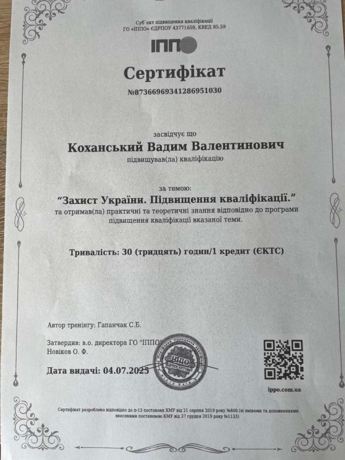 Викладач циклу вогневої підготовки Вадим КОХАНСЬКИЙ пройшов курс «Сучасна військова підготовка», що є вкрай актуальним в умовах сучасних безпекових викликів. Завдяки цьому він суттєво розширив знання щодо підготовки особового складу до дій у кризових ситуаціях. Він також завершив програму «Захист України. Підвищення кваліфікації», що сприяє більш глибокому розумінню національних пріоритетів у сфері оборони та розвитку патріотичного виховання.