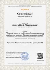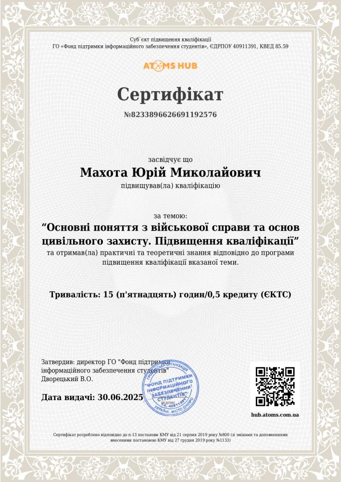 Так, начальник циклу тактико-фізичної підготовки Юрій МАХОТА успішно завершив онлайн-курси підвищення кваліфікації з фізичної культури. Отримані знання та сучасні підходи до організації фізичної підготовки дозволять йому ефективно готувати слухачів до служби в умовах підвищених фізичних і психологічних навантажень. Крім того, він опанував програму «Основні поняття з військової справи та основ цивільного захисту», що дозволяє більш глибоко інтегрувати питання національної безпеки в освітній процес.