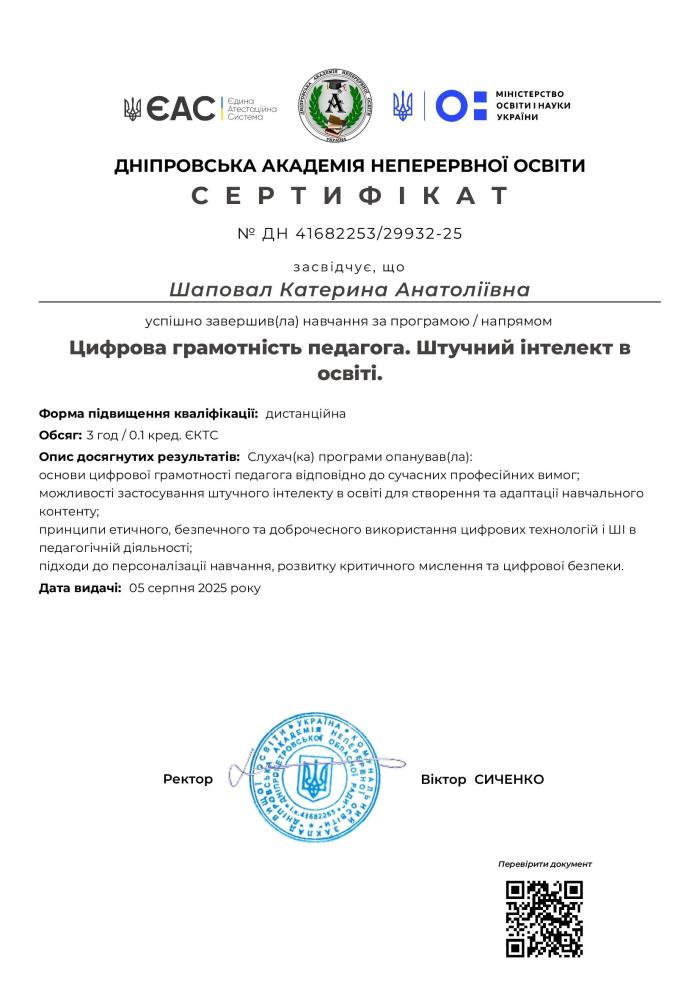 Докторантка відділу аспірантури (ад'юнктури) та докторантури Катерина ШАПОВАЛ і адʼюнкт цього ж відділу Даніїл ЗІНЧЕНКО завершили курс за програмою «Цифрова грамотність педагога. Штучний інтелект в освіті». Під час навчання вона опанувала основи цифрової грамотності педагога відповідно до сучасних професійних вимог, можливості застосування штучного інтелекту для створення та адаптації освітнього контенту, принципи етичного та безпечного використання цифрових технологій у педагогічній діяльності, а також підходи до персоналізації навчання, розвитку критичного мислення та цифрової безпеки.