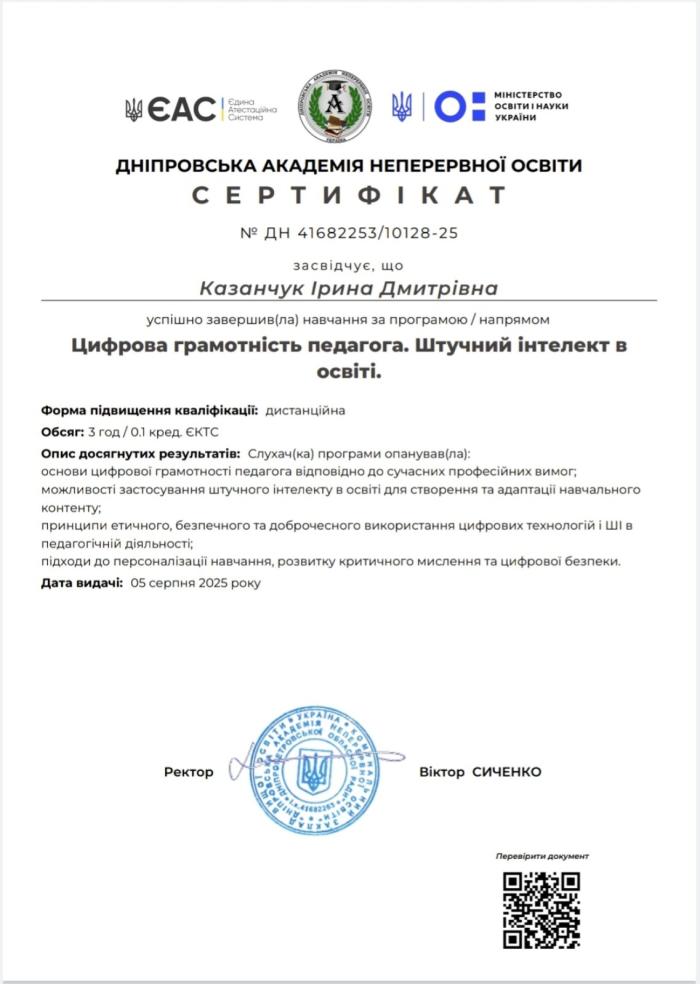 Професорка кафедри адміністративного права та процесу ННІ №3 Ірина КАЗАНЧУК долучилася до освітнього курсу за програмою «Цифрова грамотність педагога. Штучний інтелект в освіті», організованому Дніпровською Академією неперервної освіти за підтримки партнерів ЄАС (інститутів підвищення кваліфікації) та Громадської організації «ЦИФРОВІЗАЦІЯ ОСВІТИ УКРАЇНИ». Викладачка отримала знання та навички з основ цифрової грамотності педагога відповідно до сучасних професійних вимог, щодо можливостей застосування штучного інтелекту в освіті для створення та адаптації освітнього контенту, принципів етичного, безпечного та доброчесного використання цифрових технологій і ШІ у педагогічній діяльності.