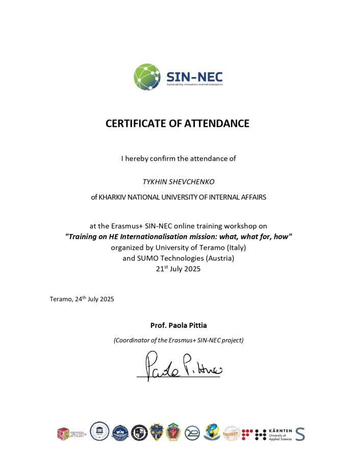 Тренінг проходив у межах проєкту Erasmus+ SIN-NEC «Сталість та спроможність інтернаціоналізації з метою модернізації вищої освіти для дебютантів із країн Східного партнерства» та був організований університетом міста Терамо (Італія) спільно з компанією SUMO Technologies (Австрія). Учасники обговорили основні аспекти розроблення та управління міжнародними освітніми проєктами, зокрема: проєктування міжнародних ініціатив (Paola Pittia, UNITE), написання та менеджмент проєктів (Rainer Svacinka, SUMO), роль студентів у процесах інтернаціоналізації ЗВО.