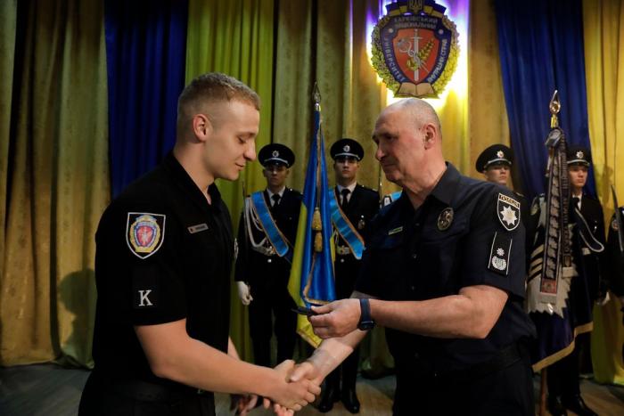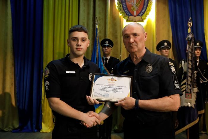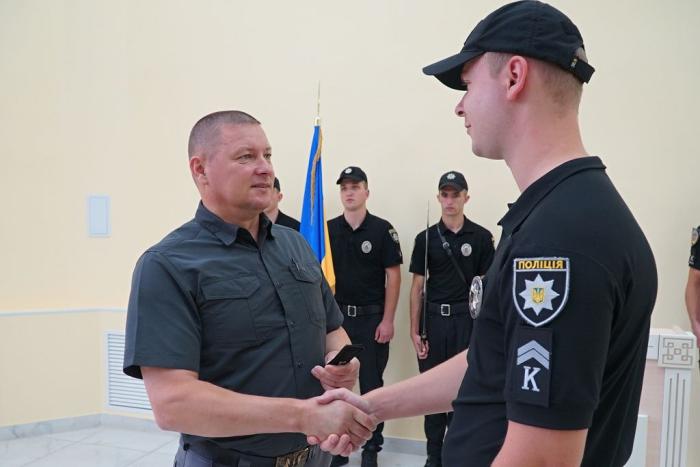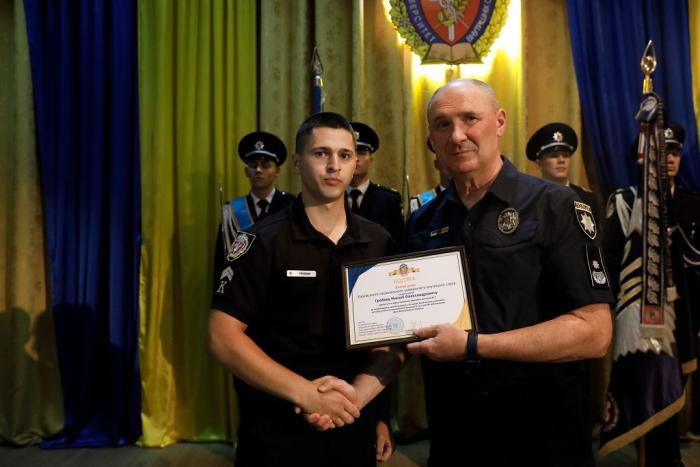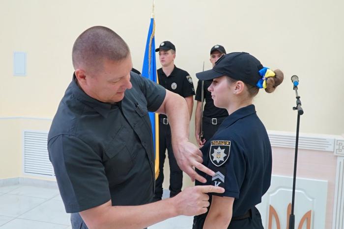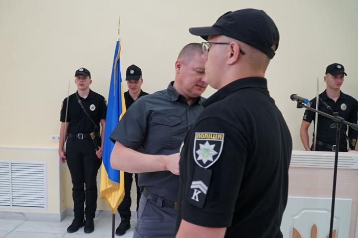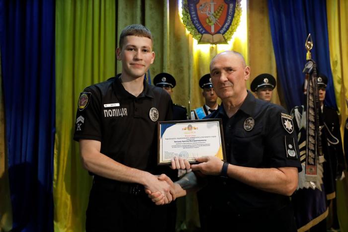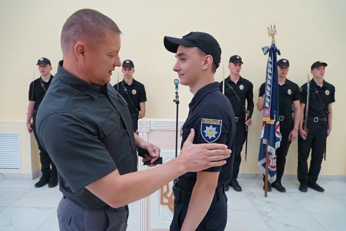 Проректор привітав і вручив погони курсантам, яким присвоєно чергові спеціальні звання молодшого складу. Погони капрала поліції отримали: