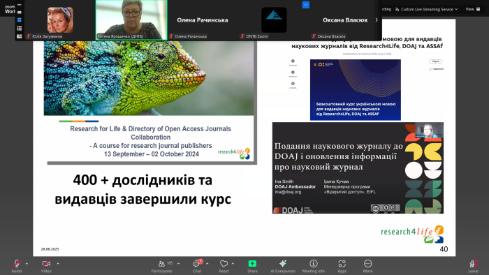 Наступний захід – «Research4Life в Україні: партнерство для науки та розвитку» – відкрив для науковців широкі можливості доступу до провідних світових інформаційних ресурсів. З січня 2023 року Україна отримала безкоштовний доступ до проєкту Research4Life, що надає можливість користуватися десятками тисяч журналів і книг від провідних видавництв, зокрема Elsevier, Springer Nature, Wiley та інших. Учасникам представили переваги використання баз даних проєкту, що охоплюють дослідження у сферах права та глобальної справедливості (GOALI), охорони здоров’я (Hinari), сільського господарства (AGORA) та інновацій (ARDI), що є важливим інструментом для якісної наукової роботи.