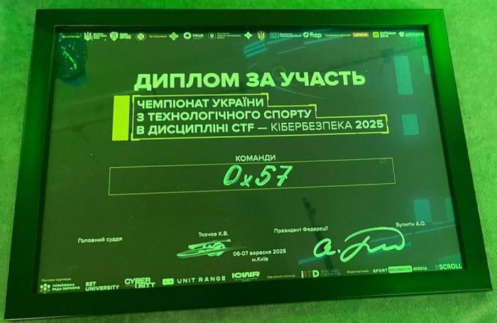 Команда «0x57», до складу якої увійшли представники ННІ №4 Харківського національного університету внутрішніх справ Артем ШИМКО та Микита ВЕРЗІЛОВ, посіла 5 місце серед 33 команд з усієї України у першому національному чемпіонаті з технологічного спорту у дисципліні Capture the Flag (CTF) – кібербезпека 2025.