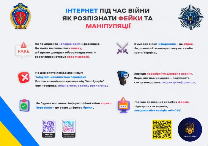 Будьте уважними, переглядаючи новини в соціальних мережах та вебресурсах Інтернету, вони можуть містити фейки та різноманітні техніки маніпулювання. Щоб уберегти себе та своїх близьких, варто дотримуватися простих порад, які допоможуть розпізнати неправдиву інформацію. Центр цифрової обізнаності та кібергігієни ХНУВС поширює інфографіку й організовує заходи, спрямовані на підвищення рівня цифрової обізнаності громадян і формування культури безпечної поведінки в онлайн-просторі.