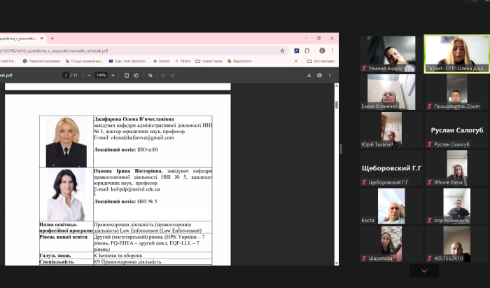 Онлайн-захід провела гарант освітньо-професійної програми, завідувачка кафедри адміністративної діяльності ННІ №3, докторка юридичних наук, професорка Олена ДЖАФАРОВА. Вона представила кожен із запропонованих компонентів, акцентувавши увагу на їхньому практичному значенні та можливостях для поглиблення спеціалізованих знань. Окремо було розглянуто структуру Каталогу. Гарант наголосила, що всі необхідні матеріали містять вичерпний опис кожного вибіркового освітнього компоненту та розміщені на офіційному сайті університету.