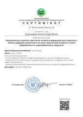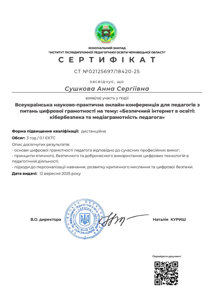 Старша викладачка кафедри правового забезпечення підприємницької діяльності та фінансової безпеки ННІ №5 Анна СУШКОВА взяла участь у Всеукраїнській онлайн-конференції для науково-педагогічних працівників із питань цифрової грамотності на тему: «Безпечний інтернет в освіті: кібербезпека та медіаграмотність педагога».