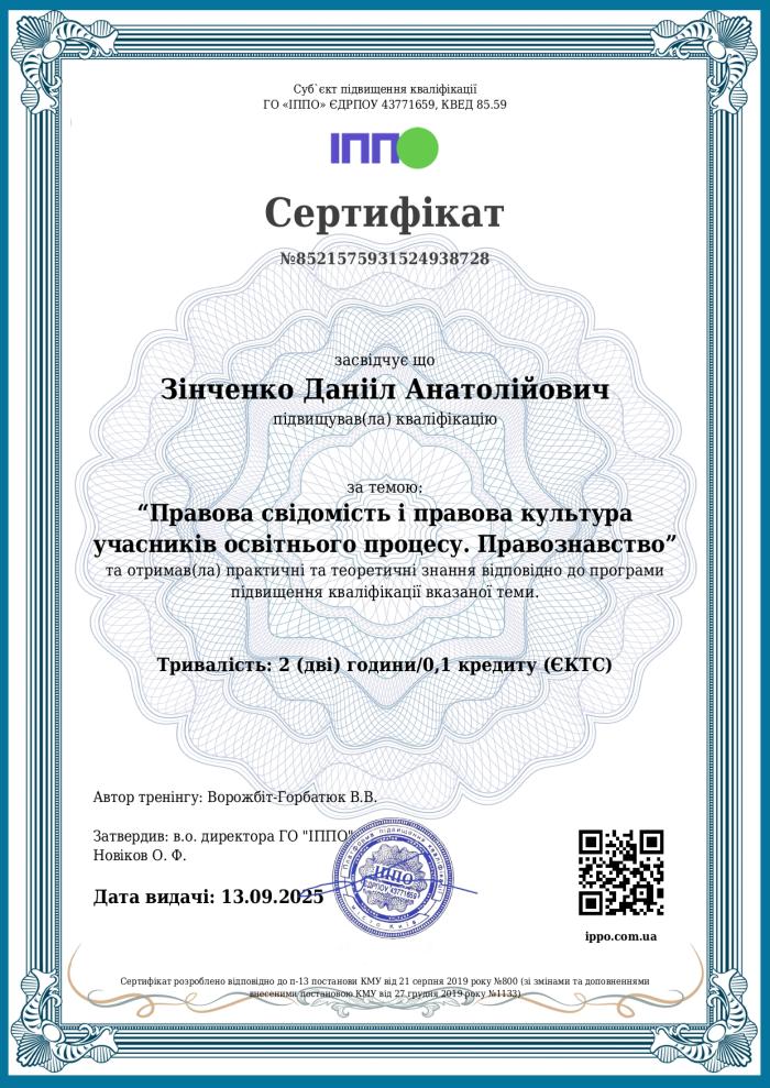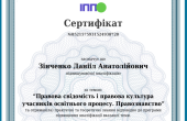 Онлайн-курс за темою «Правова свідомість і правова культура учасників освітнього процесу. Правознавство», що проводив Інститут післядипломної педагогічної освіти, успішно пройшов ад’юнкт відділу аспірантури (ад’юнктури) і докторантури Данііл ЗІНЧЕНКО.