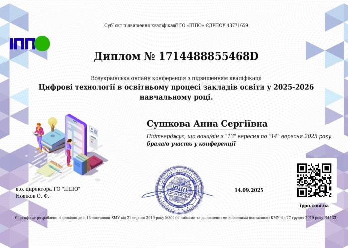 Старша викладачка кафедри правового забезпечення підприємницької діяльності та фінансової безпеки ННІ №5 Анна СУШКОВА взяла участь у Всеукраїнській онлайн-конференції з підвищенням кваліфікації для науково-педагогічних працівників на тему: «Цифрові технології в освітньому процесі закладів освіти у 2025-2026 навчальному році». Під час заходу приділили увагу роботі з цифровими освітніми ресурсами для покращення якості навчання, забезпечення доступу до знань і формування цифрової грамотності здобувачів освіти.
