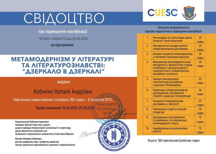 Доцентка кафедри гуманітарних дисциплін та українознавства, кандидатка філологічних наук Наталія КОБИЛКО взяла участь у Всеукраїнському науково-педагогічному підвищенні кваліфікації «Метамодернізм у літературі та літературознавстві: “дзеркало в дзеркалі”», організованого Львівським національним університетом імені Івана Франка та Центром українсько-європейського наукового співробітництва. Під час заходу учасники відвідали лекції провідних науковців: «Метамодерн у літературознавстві: сітка метафор у дзеркалах інтерпретацій» (спікерка – Лідія МАЦЕВКО-БЕКЕРСЬКА), «Медійне різноманіття сучасної поезії: потенційні переваги та ризики у дослідженні й викладанні» (спікер – Любомир БОРАКОВСЬКИЙ), «Шлях до сприймання ІНШОГО: національна ідентичність та стереотип (на матеріалі коміксів про Астерікса)» (спікер – Ірина КУШНІР), «Афективні структури в метамодерній прозі» (спікер – Роксоляна КОХАН). Слухачі поглибили свої знання з новітніх літературознавчих досліджень, формування метамодерністської методології у філологічних студіях, дослідницьких експериментів у сприйманні та інтерпретації метамодерного тексту. Також учасники виконували індивідуальну роботу – написання тез, які ввійшли до збірника матеріалів науково-педагогічного підвищення кваліфікації. Наталія КОБИЛКО опублікувала розвідку «Художні особливості щоденника Володимира Вакуленка-К.», де розглянула символіку часових і просторових образів російсько-української війни.