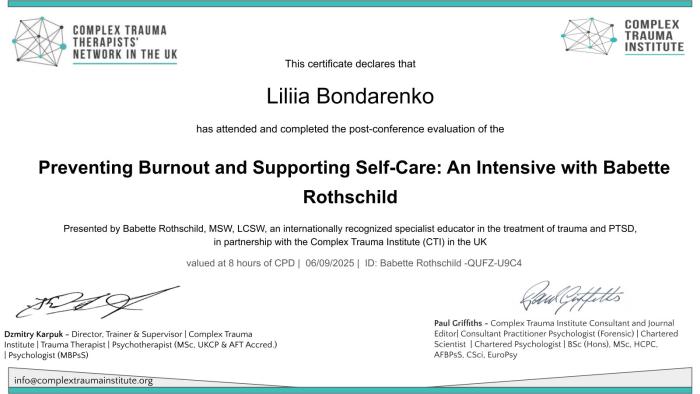 Доцентки кафедри соціології та психології ННІ №5 Ірина ЖДАНОВА, Яна ПОНОМАРЕНКО, Юлія ТВЕРДОХВАЛОВА та Лілія БОНДАРЕНКО взяли участь у вебінарі «Preventing Burnout and Supporting Self-Care: An Intensive with Babette Rothschild», організованому COMPLEX TRAUMA THERAPISTS’ NETWORK IN THE UC. Під керівництвом спікерки, експертки з терапії травми, тілесної саморегуляції та професійного добробуту Бабетт РОТШИЛЬД та її колег Нес БЕАР і Патриції БУРКЕ Д’СОУЗА були опрацьовані сучасні техніки з профілактики професійного вигорання та самодопомоги: тілесна перкусія, балансування, «дерево життя», плейлист «Піднесення». Експертка відповіла на всі запитання слухачів і поділилася своїм клінічним досвідом.