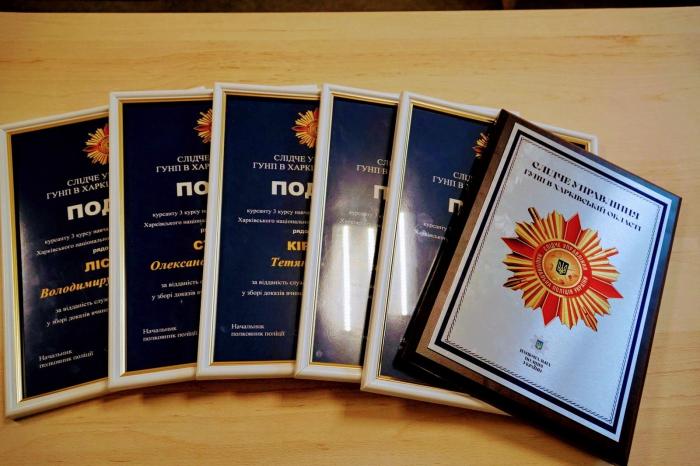 У навчально-науковому інституті №4 урочисто відзначили здобувачів освіти за відданість службі та вагомий внесок у зборі доказів вчинення збройної агресії проти України. Подяки від керівництва Слідчого управління ГУНП у Харківській області отримали – Дмитро КАЛІНІН, Тетяна КІРЕЄВА, Олександр СТЄБЛІН, Володимир ЛІСОВОЛ та Микола РИЛЬЦЕВ.