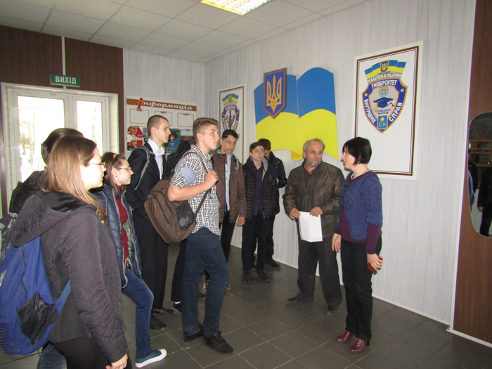 Завідувач кафедри соціально-економічних дисциплін Сумської філії Олена Анатоліївна Лук’янихіна розповіла їм про особливості підготовки юристів, ознайомила з роботою юридичної клініки та матеріально-технічною базою філії. Також школярі відвідали кабінет криміналістики, яким опікується викладач кафедри юридичних дисциплін Віктор Кисельов. Учні із задоволенням слухали його розповідь про методи роботи експертів-криміналістів і навіть апробували деякі з них, активно цікавились експонатами. Бесіда відбулася у формі діалогу, а розповідь Віктора Миколайовича викликала у присутніх зацікавленість до роботи в юридичній сфері.