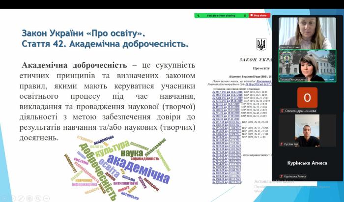 Старша викладачка Анна РЕШИТЬКО акцентувала увагу, що академічна доброчесність і відкритість – це фундамент для якісної науки. Вона детально зупинилася на принципах роботи та відповідальності за їх порушення.