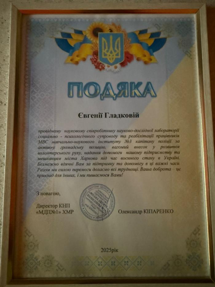 Провідна наукова співробітниця науково-дослідної лабораторії соціально-психологічного супроводу та реабілітації працівників МВС ННІ №3 Євгенія ГЛАДКОВА разом із командою волонтерів Благодійної організації «БФ “Долоньки миру”» передали медичне обладнання – центрифуги для очищення крові – міській дитячій поліклініці №1 міста Харкова. Крім того, було надано гуманітарну допомогу внутрішньо переміщеним особам і мешканцям Київського району Харкова: люди отримали теплий одяг та інші необхідні речі.