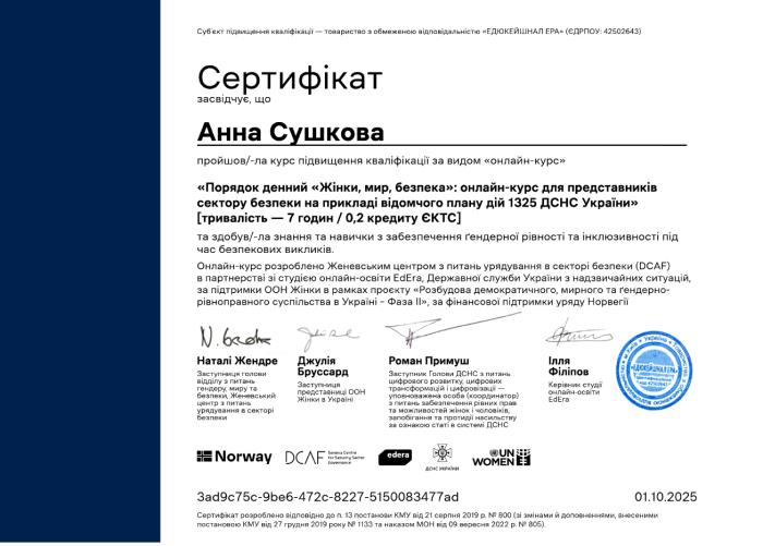 Працівниці кафедри правового забезпечення підприємницької діяльності та фінансової безпеки – завідувачка Ольга ГЕТМАНЕЦЬ та старша викладачка Анна СУШКОВА – пройшли курс «Порядок денний «Жінки, мир, безпека»». Курс розроблено Женевським центром з питань урядування в секторі безпеки (DCAF) у партнерстві зі студією онлайн-освіти EdEra та Державною службою України з надзвичайних ситуацій за підтримки ООН Жінки в рамках проєкту «Розбудова демократичного, мирного та ґендерно рівноправного суспільства в Україні – Фаза ІІ», за фінансової підтримки уряду Норвегії.