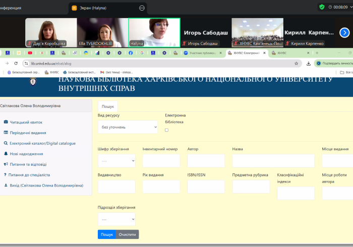 Олена СВІТЛАКОВА представила: електронний каталог із понад 450 тис. бібліографічних записів; електронну бібліотеку, що налічує 115 тис. файлів; репозитарій ХНУВС із близько 21 тис. наукових публікацій авторів університету; електронну патріотичну бібліотеку; бібліотечний портал із дистанційним доступом до всіх ресурсів та сервісів університетської бібліотеки.