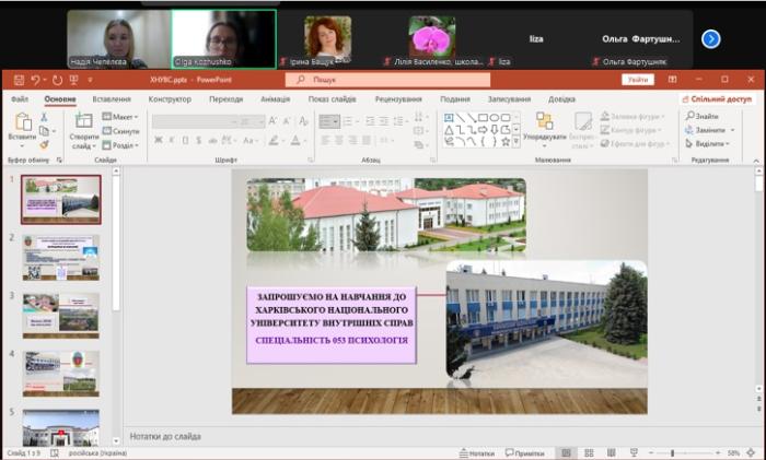 Викладачка кафедри соціології і психології ННІ №5 Надія ЧЕПЕЛЄВА провела онлайн-зустріч із випускниками Харківського ліцею №6. Вона ознайомила учнів із можливістю вступу до ННІ №5, зокрема за спеціальністю «Психологія», детально розповіла про особливості освітнього процесу, напрями підготовки та професійні перспективи майбутніх фахівців.