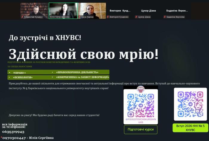 У межах профорієнтаційної роботи представники кафедри кримінального права та кримінології ННІ №5 – доцент кафедри Владислав КУНДЕУС і старша викладачка кафедри Юлія МИТРОФАНОВА – зустрілися онлайн з учнями 11 класу КЗ «Борівський ліцей імені С. Закори» Зміївської міської ради Чугуївського району Харківської області.