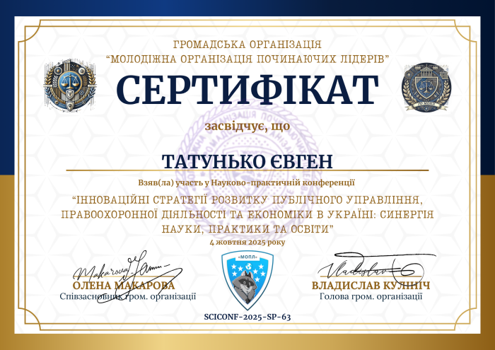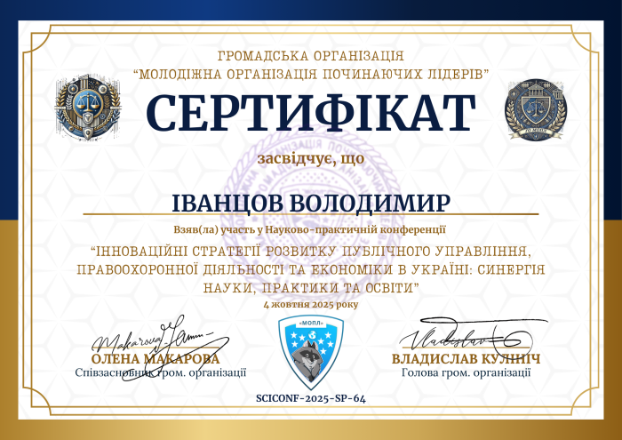 У місті Вінниця відбулася науково-практична конференція «Інноваційні стратегії розвитку публічного управління, правоохоронної діяльності та економіки України: синергія науки, практики та освіти», організована Громадською організацією «Молодіжна Організація Починаючих Лідерів». Захід, що проходив у змішаному форматі, проводився спільно відділом аспірантури (ад'юнктури) і докторантури ХНУВС. Його представляли професор кафедри адміністративної діяльності ННІ №3 Володимир ІВАНЦОВ та ад'юнкти відділу Данііл ЗІНЧЕНКО та Євген ТАТУНЬКО. Форум об’єднав велику кількість науковців, практиків, здобувачів вищої освіти та курсантів, які представили результати власних досліджень і наукових розвідок. Учасники подали значну кількість тез, що охоплювали широке коло актуальних тем – від модернізації системи публічного управління до підвищення ефективності правоохоронної діяльності та економічного розвитку держави. Вони ділилися досвідом, ідеями та пропозиціями щодо вдосконалення державних механізмів управління, забезпечення правопорядку та підтримки сталого розвитку суспільства.