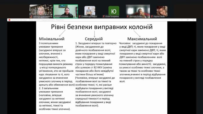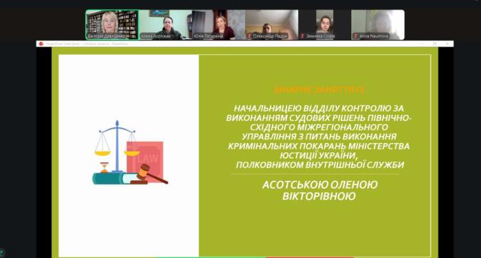 Начальниця відділу контролю за виконанням судових рішень Північно-Східного міжрегіонального управління з питань виконання кримінальних покарань Міністерства юстиції України Олена АСОТСЬКА та професорка кафедри кримінального права та кримінології ННІ №5 Вікторія ДАВИДЕНКО провели бінарне заняття для студентів-правників на тему «Основні напрямки діяльності відділу контролю за виконанням судових рішень міжрегіонального управління з питань виконання кримінальних покарань».