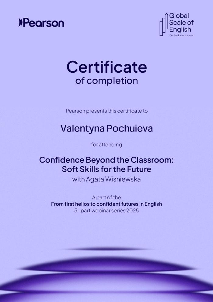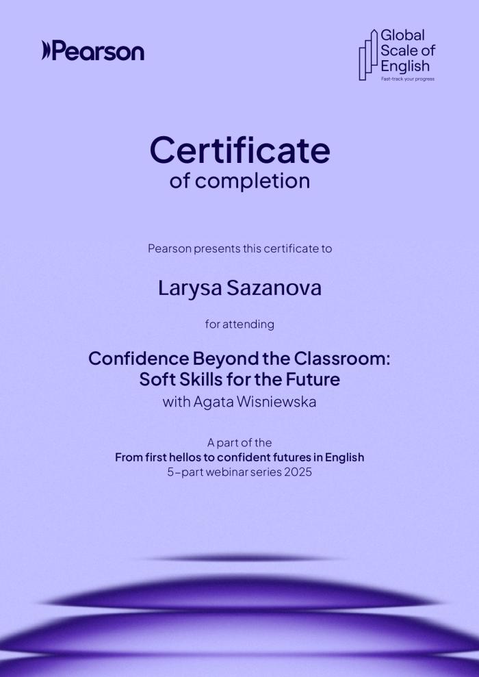 Представники кафедри мовної підготовки – завідувачка кафедри Олена СТАТІВКА, доценти цієї ж кафедри Олег ГОНЧАРУК та Валентина КОЧИНА, старші викладачі Валентина ПОЧУЄВА, Лариса САЗАНОВА та Артем БІЛОУСОВ – долучилися до Міжнародного онлайн-вебінару «Confidence Beyond the Classroom: Soft Skills for the Future», організованого компанією Pearson.