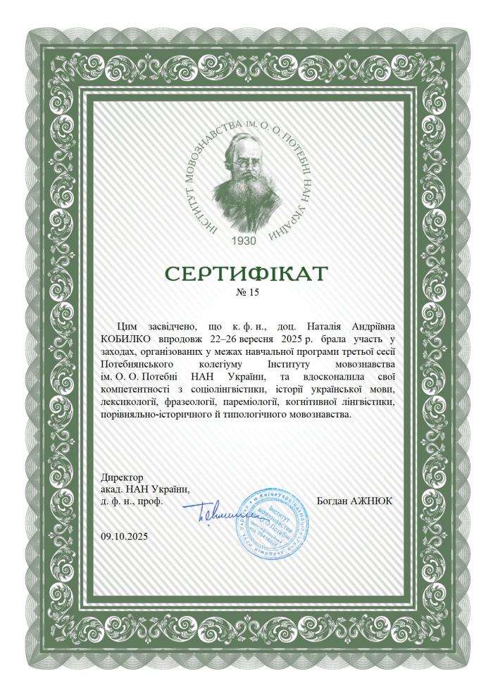 Наталія ЄЛЬНІКОВА та Наталія КОБИЛКО вдосконали свої компетентності з соціолінгвістики, історії української мови, лексикології, фразеології, пареміології, когнітивної лінгвістики, порівняльно-історичного й типологічного мовознавства. Після завершення освітньої програми «Потебнянський колегіум» викладачки отримали сертифікати підвищення кваліфікації.