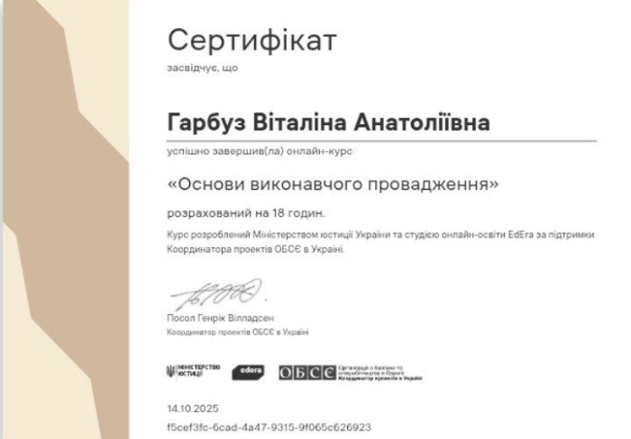 За ініціативи студентської ради навчально-наукового інституту №5 здобувачі освіти пройшли онлайн-курс «Основи виконавчого провадження» та отримали сертифікати. Учасники курсу поглибили свої знання з тематики виконавчого провадження, що є важливою складовою правознавчої підготовки та професійної компетентності.