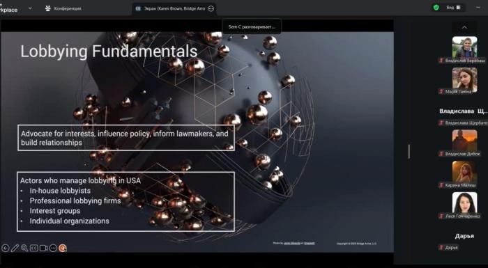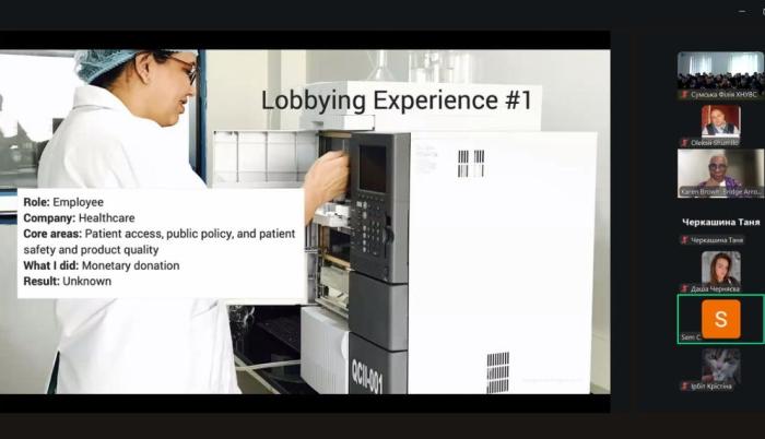 Спікерка зупинилася на характеристиці суб’єктів лобізму у США – внутрішніх лобістів, професійних фірм, груп інтересів і неприбуткових організацій. Вона наголосила, що ефективність лобістської діяльності залежить від професійної підготовки її учасників і дотримання законодавчих процедур.