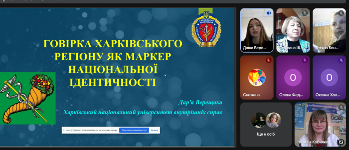 Дар’я ВЕРЕЩАКА виголосила доповідь «Говірка Харківського регіону як маркер національної ідентичності», де дослідила особливості мовлення харків’ян, популярні діалектизми, вплив державної політики на формування мови регіону. У підсумку здобувачка зазначила, що Харків був і залишається важливим осередком збереження культурної самобутності нашої нації.