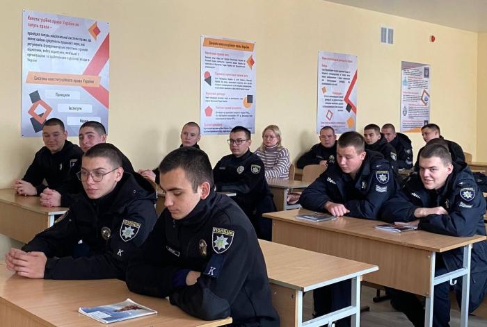 Викладачка кафедри мовної підготовки Карина ЮЩИШИНА та слідчий відділу розкриття злочинів, скоєних проти життя та здоров'я особи Кам’янець-Подільського районного управління поліції ГУНП в Хмельницькій області Олександр БАРБАНЮК провели заняття на тему «Дії поліції» для курсантів 2 курсу ННІ №4.