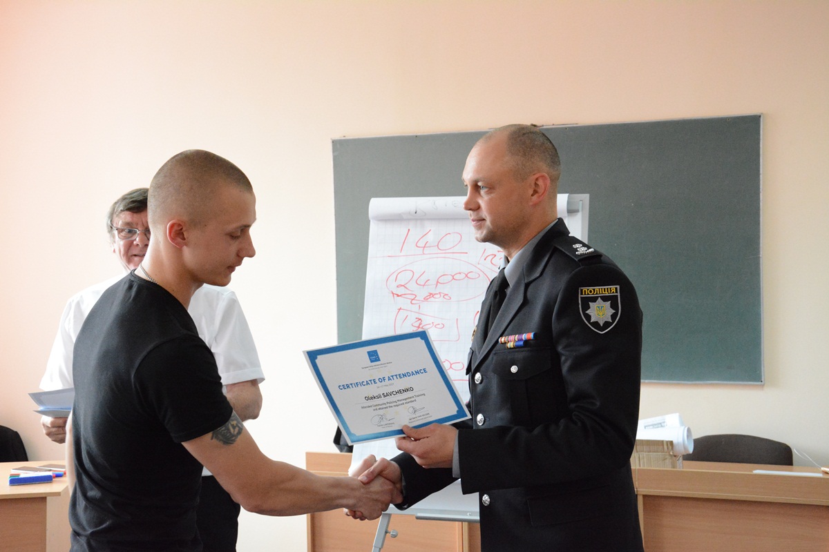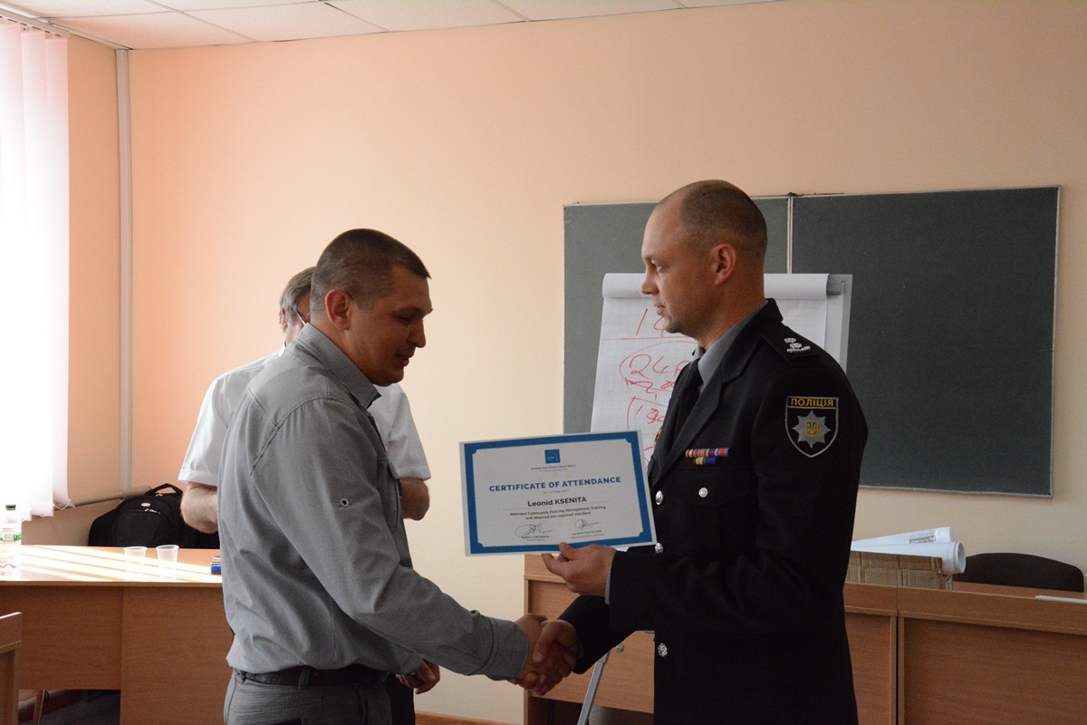 Патрульні та дільничні офіцери поліції ГУНП України Донецької та Луганської областей пройшли тренінг з питань взаємодії поліції з громадськістю, який проводився на базі Харківського національного університету внутрішніх справ. Сертифікати слухачам вручили перший проректор університету підполковник поліції Дмитро Швець та радник/тренер з питань взаємодії поліції з громадськістю Консультативної місії ЄС Пітер Вілсон.