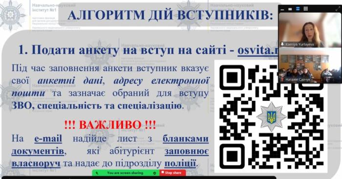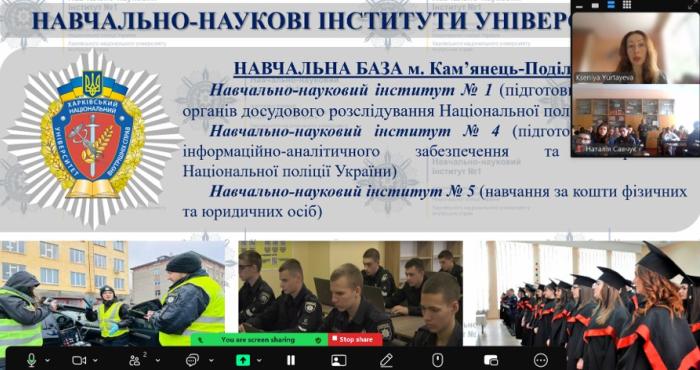 Доцентка кафедри кримінального права і кримінології навчально-наукового інституту №1 кандидатка юридичних наук, доцентка Ксенія ЮРТАЄВА провела онлайн-зустріч зі старшокласниками Вашківецького закладу загальної середньої освіти І-ІІІ ступенів імені Івана Бажанського Вижницького району Чернівецької області. У форматі відеоконференції. викладачка розповіла учням про структуру Харківського національного університету внутрішніх справ та спеціальності, за якими здійснює підготовку виш, звернула увагу на можливість навчання за державним замовленням і за кошти фізичних та юридичних осіб. Доцентка окреслила переваги навчання у ХНУВС, зокрема звернула увагу на матеріальне забезпечення курсантів, що здобувають освіту за державним замовленням, можливість пройти автокурси в безбар’єрній автошколі та отримати посвідчення водія категорії «В», брати участь у гуртках самодіяльності, залучатися до заходів Школи наукового лідерства та курсантсько-студентського самоврядування тощо. Наприкінці зустрічі Ксенія ЮРТАЄВА відповіла на запитання майбутніх абітурієнтів та надала необхідні посилання на сторінку для вступників до ХНУВС https://univd.edu.ua/uk/dir/3/vstupnyku, а також звернула увагу на необхідність своєчасного подання заявки на вступ до університету через сайт Національної поліції України https://osvita.np.gov.ua.