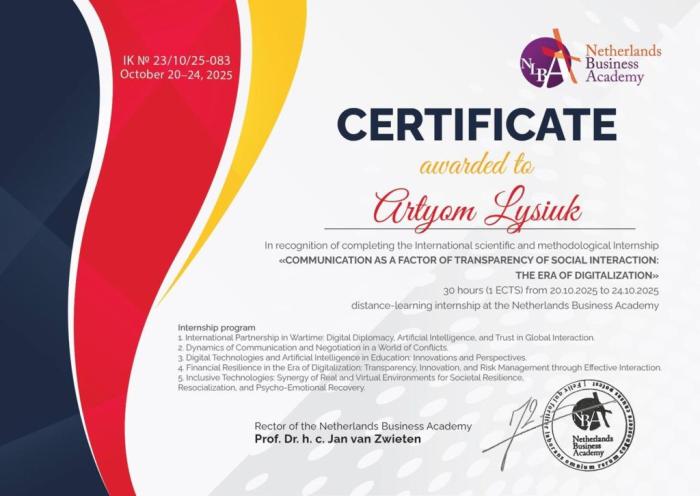 Під час конференції також було організовано міжнародне стажування, спрямоване на розвиток академічних і комунікативних компетентностей молодих дослідників. За результатами участі Анна МАРАХОВЄЦЬ та Артем ЛИСЮК отримали сертифікати про участь у конференції та проходження 30-годинного міжнародного стажування.