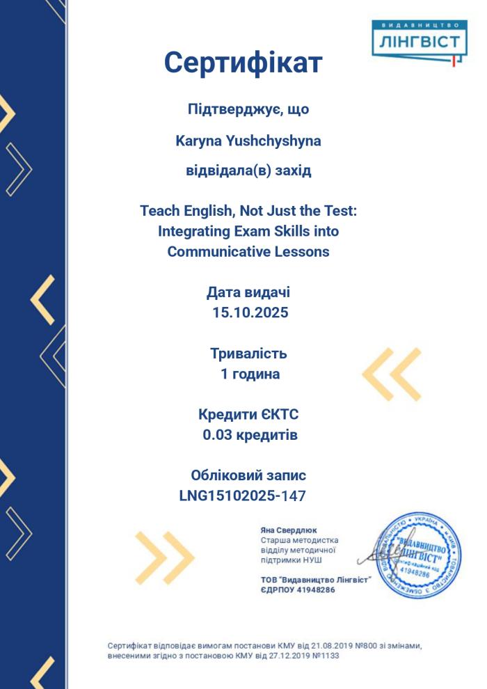 Доцентка кафедри мовної підготовки Валентина КОЧИНА та викладачка цієї ж кафедри Карина ЮЩИШИНА долучилися до Міжнародного онлайн-вебінару «Teach English, Not Just the Test: Integrating Exam Skills into Communicative Lessons», проведеного спікером компанії «Лінгвіст». Викладачки отримала корисну інформацію про те, як навчати англійської повноцінно, знайти баланс у комунікативному підході та зробити знання здобувачів освіти системними. На заході було продемонстровано, як будувати заняття таким чином, щоб природно засвоюювалися навички, необхідні для успішного складання будь-якого іспиту.