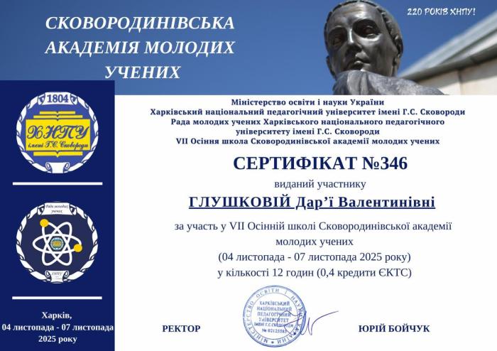 Доцентка кафедри правоохоронної діяльності ННІ №5 Дар’я ГЛУШКОВА взяла участь у VII Осінній школі Сковородинівської академії молодих учених, що відбулася на базі Харківського національного педагогічного університету імені Г. С. Сковороди.
