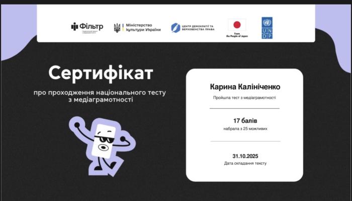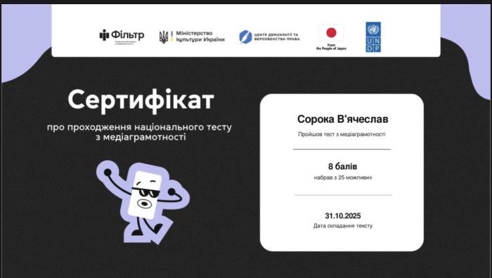 За результатами тестування всі отримали сертифікати, підтвердивши рівень обізнаності у сфері медіаграмотності, критичного мислення та безпечного користування інформаційними ресурсами.