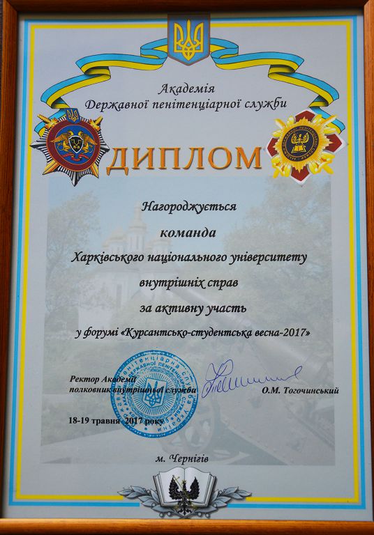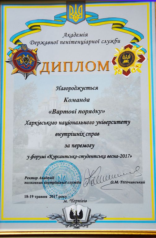 Від імені ректорату Харківського національного університету внутрішніх справ ректор навчального закладу генерал поліції третього рангу Валерій Сокуренко привітав команду університету «Вартові порядку» з перемогою у форумі «Курсантсько-студентська весна 2017».