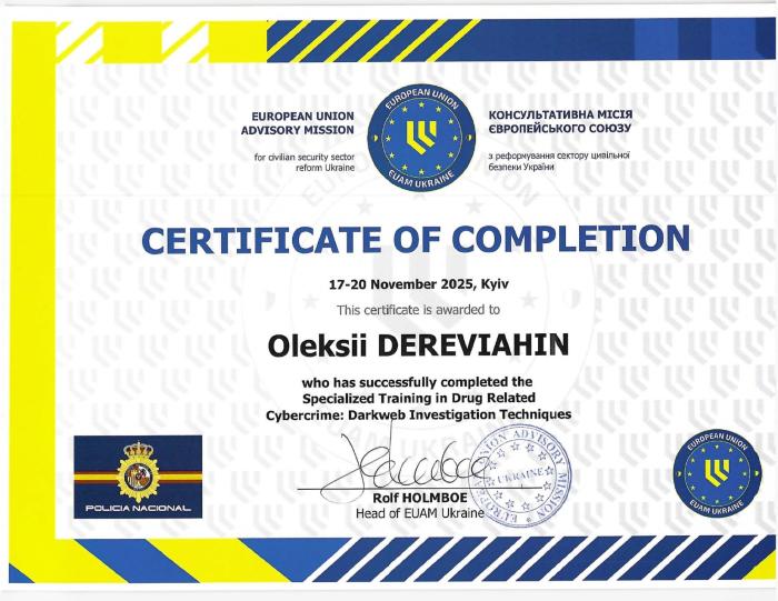 Захід відбувся за сприяння відділу міжнародного співробітництва, підтримки Консультативної місії ЄС (EUAM) та експертів Європолу (Europol), який об’єднав представників правоохоронних органів України та інших європейських країн. Учасники ознайомилися з міжнародною практикою розслідувань, сучасними тенденціями у Darkweb, програмою EMPACT, методами забезпечення оперативної безпеки та роботи на Darknet-маркетплейсах, поглибили знання з OSINT-технік та інструментів цифрової розвідки, а також відпрацювали навички цифрової криміналістики й моделювання реальних розслідувань.