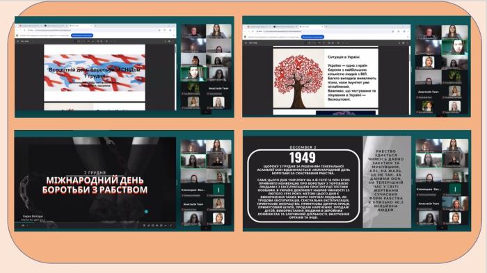 Під час засідання члени гуртка презентували такі теми: Єлізавета СТАДНИК та Анастасія ТКАЧ «25 листопада – Міжнародний день боротьби з насильством щодо жінок», Валерія КЛИНИЦЬКА «1 грудня – Всесвітній день боротьби зі СНІДом», Вікторія КИРКО «2 грудня – Міжнародний день боротьби з рабством», Марія БІЛИК «3 грудня – Міжнародний день людей з обмеженими фізичними можливостями», Вікторія КУЗЕМА «5 грудня – Міжнародний день волонтера», Юліана МАНТУЛЯК «6 грудня – Вшанування пам’яті студенток, розстріляних у Монреалі».