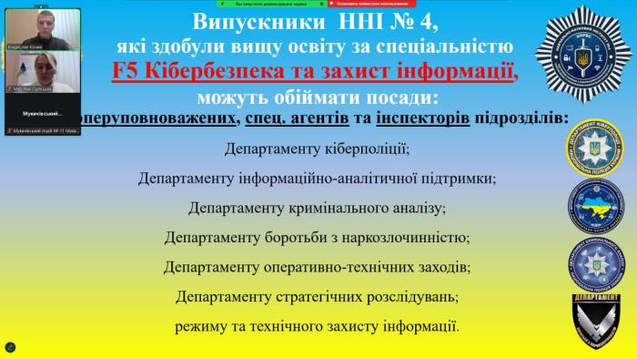 Заcтупниця начальника курсу навчально-наукового інституту №4 Мар’яна СІДЛЕЦЬКА та курсант 3 курсу Владислав КОЧИН провели онлайн-зустріч із випускниками Мукачівського ліцею №11 Мукачівської міської ради Закарпатської області.
