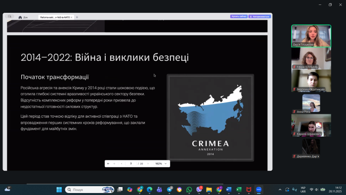 Під час зустрічі учасники обговорили ключові етапи трансформації сектору безпеки в умовах повномасштабної війни, акцентували увагу на стратегічних викликах та пріоритетах переходу України до стандартів НАТО, розглянули роль правоохоронних органів у сучасних безпекових процесах, а також проаналізували практичні приклади здійснених реформ та релевантний міжнародний досвід. Учасники гуртка проявили високий рівень зацікавленості, активно долучалися до обговорень та обміну думками, що сприяло формуванню фахового підходу до аналізу актуальних викликів у галузі поліціїстики. Науковий гурток продовжує свою діяльність, спрямовану на розвиток дослідницьких компетентностей здобувачів освіти та їх участь у вивченні сучасних тенденцій реформування сектору безпеки України.