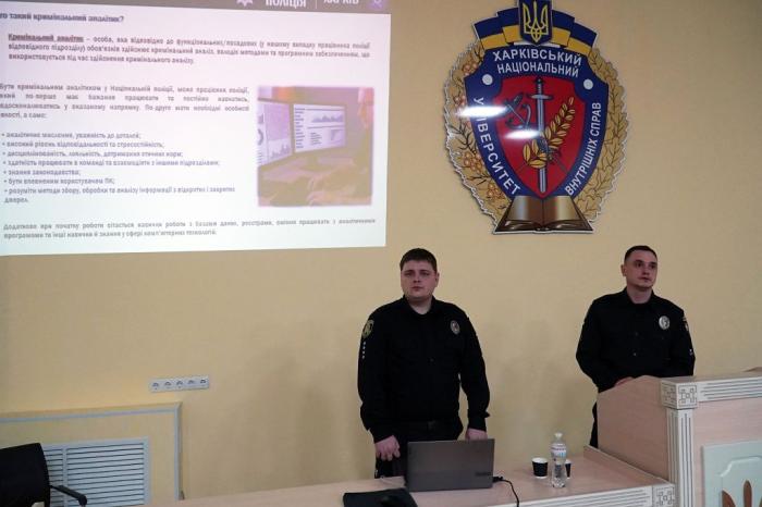 У навчально-науковому інституті №4 відбулася зустріч курсантів із фахівцями Управління кримінального аналізу ГУНП в Харківській області. Заступник начальника відділу аналітичної роботи Андрій СЕРВАТОВСЬКИЙ та начальник відділу оперативного моніторингу Роман МИШЕЧКІН обговорили зі здобувачами особливості діяльності кримінальних аналітиків.